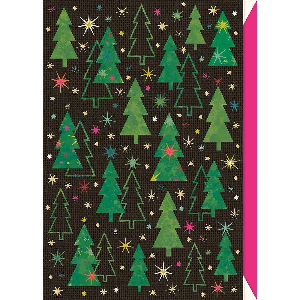 Πολυάριθμα χριστουγεννιάτικα δέντρα σε διάφορες αποχρώσεις του πράσινου υψώνονται σε ένα βαθύ σκούρο φόντο, περιτριγυρισμένα από λαμπερά αστέρια. Οι χρυσές λεπτομέρειες προσδίδουν στα δέντρα και τα αστέρια μια ευγενή λάμψη που αποτυπώνει τέλεια την εορταστική ατμόσφαιρα. Η κάρτα όχι μόνο αποπνέει κομψότητα, αλλά και μια πινελιά νοσταλγίας και συνδυάζει το παραδοσιακό χριστουγεννιάτικο σχέδιο με μοντέρνες, πολυτελείς λεπτομέρειες. Η προσεγμένη κατασκευή και τα υλικά υψηλής ποιότητας την καθιστούν ξεχωριστή ανάμεσα στις χριστουγεννιάτικες κάρτες. Ένα ιδιαίτερο πλεονέκτημα αυτή η κάρτα δεν χρειάζεται καθόλου πλαστική συσκευασία. Αντίθετα, συγκρατείται από ένα ελκυστικό χάρτινο περίβλημα που αφαιρείται εύκολα και προστατεύει το περιβάλλον.