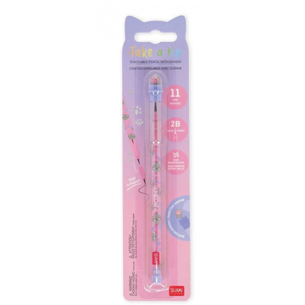Κάνε το γράψιμο στο σχολείο πιο διασκεδαστικό και πρακτικό με το Legami Στοιβαζόμενο Μολύβι με Γόμα – Take a Tip – Kitty. Με χαριτωμένο σχέδιο γατούλας και 11 ανταλλακτικές μύτες 2B, είναι πάντα έτοιμο για χρήση χωρίς να χρειάζεται ξύστρα. Πολύχρωμο, ευχάριστο και ιδανικό για παιδιά που θέλουν να έχουν στυλ και άνεση στο διάβασμα και τη δημιουργία.