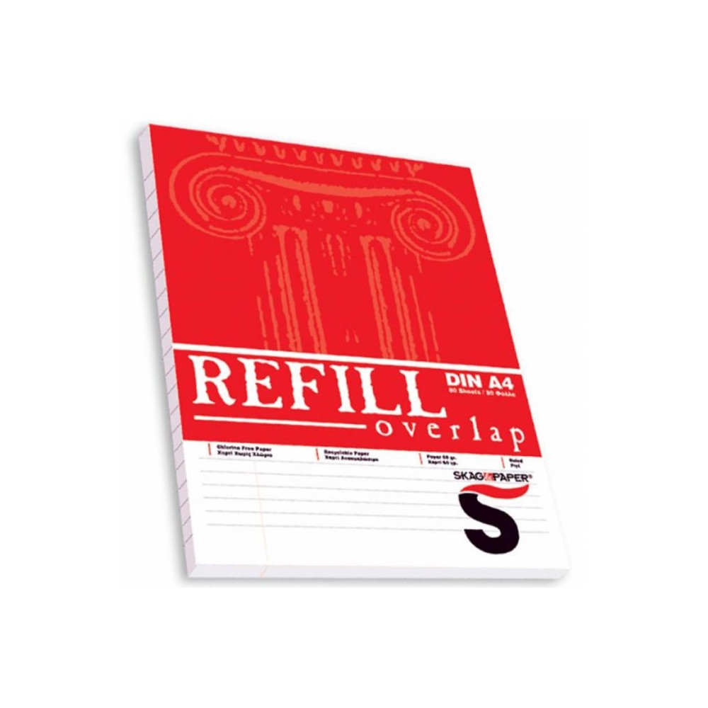Mπλοκ γραφής Refill Overlap Α4, ριγέ με περιθώριο. Περιέχουν 80 φύλλα και είναι ιδανικά για φοιτητές. Λειτουργικά, με δύο δυνατότητες ανοίγματος, το κόκκινο με όρθιο άνοιγμα. Επίσης, κάθε φύλλο μπορεί να αρχειοθετηθεί διότι τα μπλοκ αυτά διαθέτουν 4 τρύπες στην αριστερή πλευρά τους.