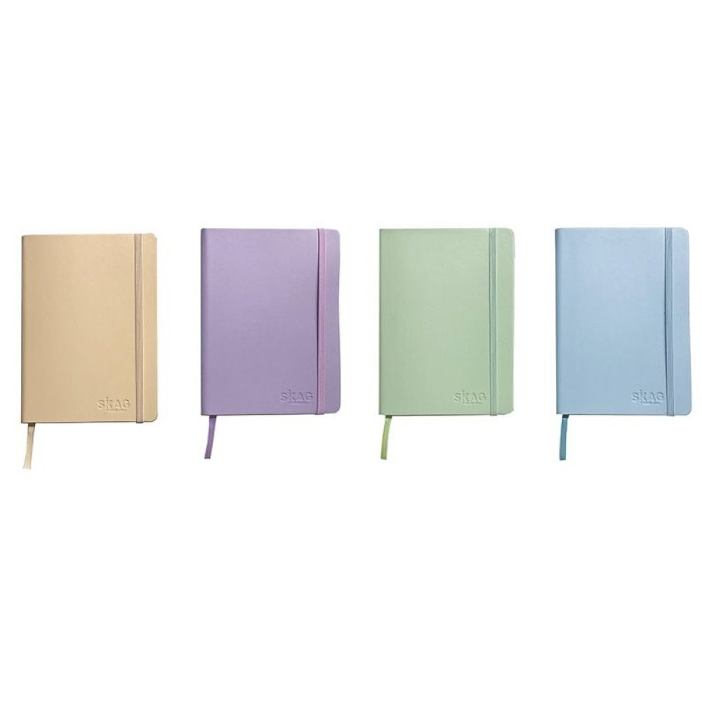 Μια όμορφη συλλογή από σημειωματάρια σε διάφορα χρώματα. Κάθε σημειωματάριο διαθέτει σκληρό εξώφυλλο με λεία, δερματίνη υφή, ελαστικό λουράκι κλεισίματος στο πλάι, και σελιδοδείκτη κορδέλα στο κάτω μέρος. Στην κάτω δεξιά πλευρά κάθε εξωφύλλου είναι τυπωμένο το λογότυπο SKAG, που υποδεικνύει ότι πρόκειται για προϊόν της γνωστής ελληνικής εταιρείας ειδών γραφικής ύλης.
