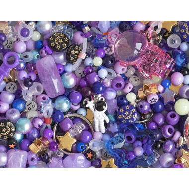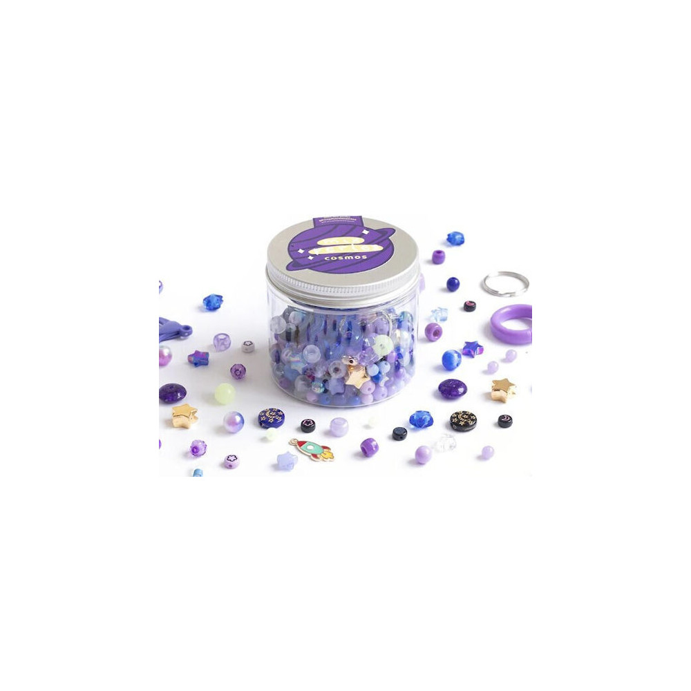 Πρόκειται για ένα δημιουργικό σετ kit για την κατασκευή χειροποίητων κοσμημάτων με θέμα το διάστημα, σε αποχρώσεις του μπλε και του μωβ.