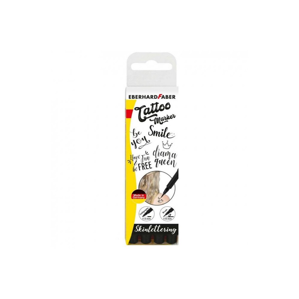 Mαρκαδόροι Eberhard Faber Tattoo δερματολογικά ελεγμένοι από την εταιρεία EBRHARD FABER. Η συσκευασία περιέχει τέσσερα τεμάχια με μελάνι μαύρο. Τα δύο έχουν μύτη 1 3mm πλακέ και τα υπόλοιπα δύο έχουν μύτη πινέλο, για καλλιγραφία, με πλάτος γραφής 1 6mm.
