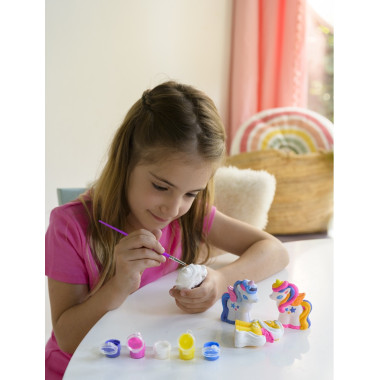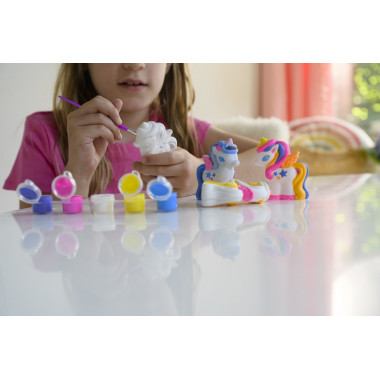 Δημιούργησε τους πιο μαγικούς τρισδιάστατους μονόκερους Βάλε τον γύψο στο καλούπι, χρωμάτισέ τον με χρώματα που σου αρέσουν και διακόσμησε το δωμάτιό σου. Μπορείτε να αρχίσετε να χρωματίζετε τον στερεοποιημένο γύψο ενώ διατηρεί ακόμα κάποια υγρασία. Όμως για καλύτερα αποτελέσματα συστήνεται να περιμένετε μέχρι ο γύψος να στεγνώσει εντελώς. Χρησιμοποιήστε τα χρώματα που σας αρέσουν ή πάρτε ιδέες από τις εικόνες της συσκευασίας. Ακολουθήστε τις συμβουλές που δίνονται στον οδηγό μείξης χρωμάτων που ακολουθεί για να δημιουργήσετε περισσότερα χρώματα. Κάποια χρώματα δεν περιλαμβάνονται στη συσκευασία.