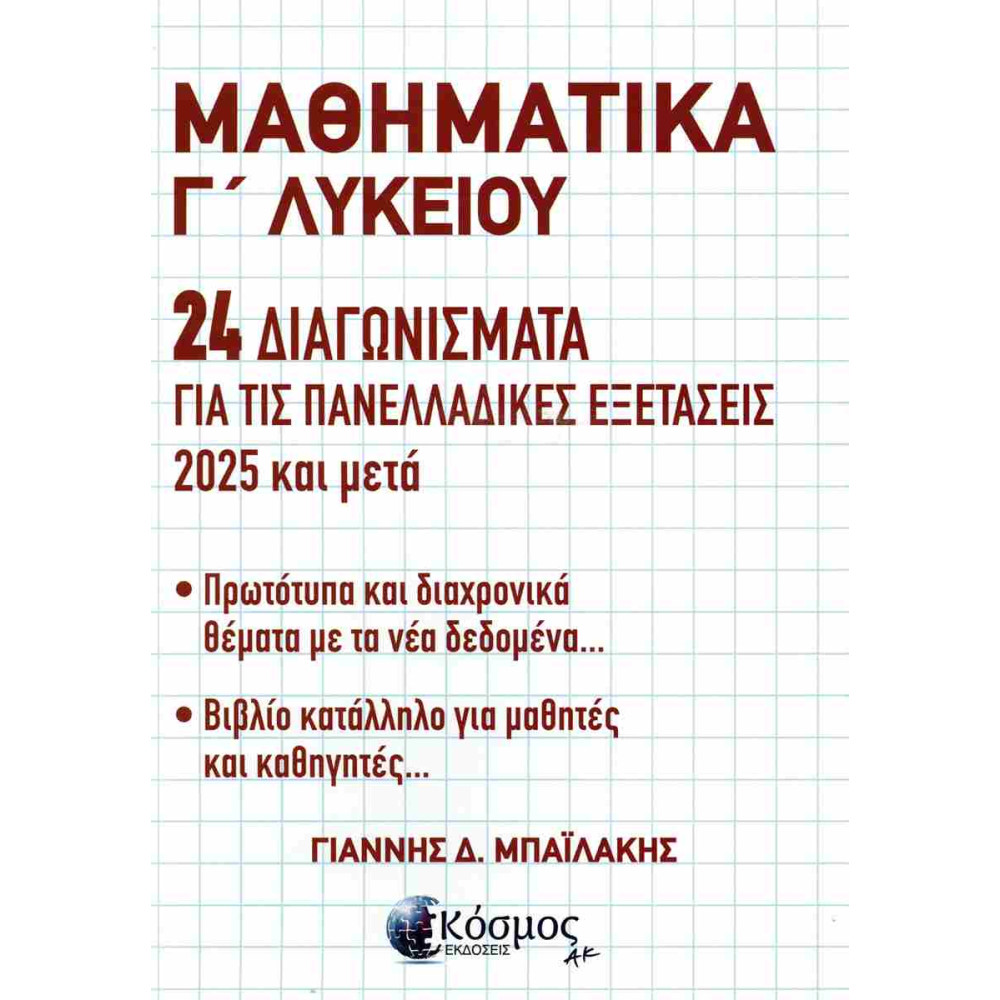 Το βιβλίο αυτό περιέχει 24 διαγωνίσματα στα Μαθηματικά της Γ΄ Λυκείου, για τις Πανελλαδικές Εξετάσεις. Αναφέρεται στις ομάδες θετικών σπουδών και Πληροφορικής Οικονομίας. Ακολουθεί το πνεύμα των Πανελλαδικών Εξετάσεων των δύο τελευταίων ετών. Καλύπτει όλη την ύλη των Μαθηματικών της Γ΄ Λυκείου με νέα, πρωτότυπα και διαχρονικά θέματα, απλά ή συνδυαστικά, χωρίς μακρόσυρτες και κουραστικές εκφωνήσεις ή λύσεις. Στο τέλος του βιβλίου υπάρχουν και κάποιες επιπλέον ασκήσεις στο Θέμα Δ. Από τον πρόλογο του συγγραφέα